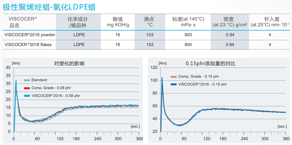 | VISCOCER@ 2216 | 低密度氧化聚乙烯蠟 | 100 | 16 | 230(140℃) | 0.94 | 白色粉末或片狀 | PVC潤(rùn)滑劑、水性乳液 |